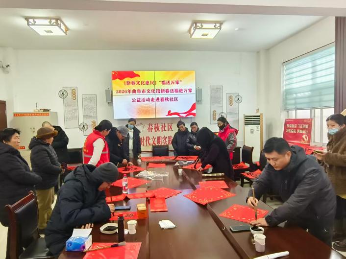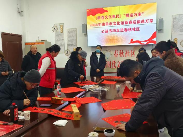 新春将至,福韵满堂。为传承中华优秀传统文化,曲阜市文化馆“新春送福进万家”公益活动于2026年1月20日下午如期走进鲁城街道春秋社区。以笔墨为媒,将马年吉祥寓意与儒家文化底蕴融入春联福字,为社区居民送上最真挚的新春祝福。